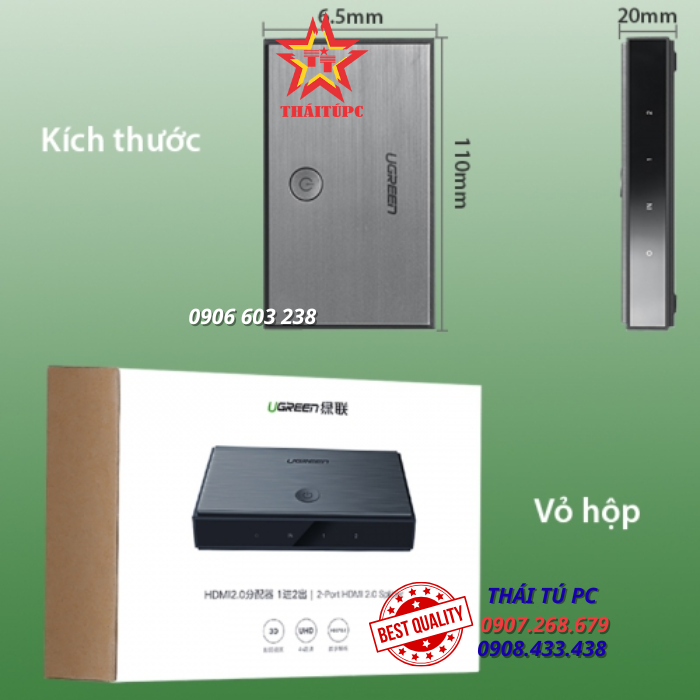- Mô tả ngắn: UGREEN 50707 - Bộ chia tín hiệu HDMI 1 thành 2, phiên bản V2.0 hỗ trợ trình 4K@60Hz, thích hợp cho các dòng TV box android, và màn hình HD4K hiện nay.