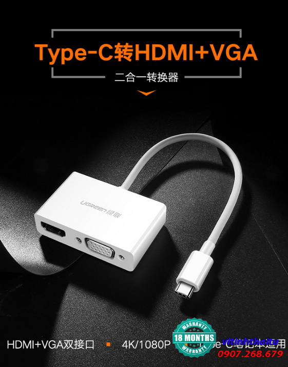 - Cáp USB Type C sang HDMI/VGA Chính hãng Ugreen 30843 được thiết kế để kết nối từ cổng USB C của MacBook với một màn hình hoặc máy chiếu có cổng HDMI/VGA độ phân giải lên đến 4K (4096x2160P).