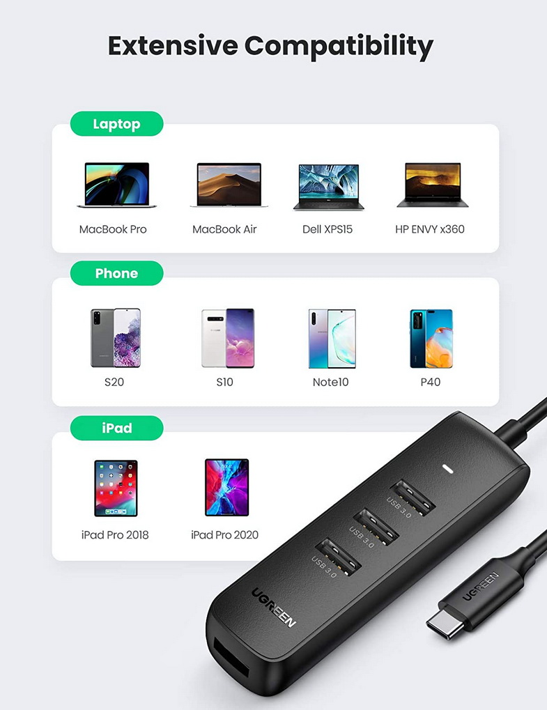 - Khả năng tương thích rộng: UGREEN USB C to USB 3.0 Hub với 4 cổng tương thích với MacBook Pro 2020/2019/2018, iPad Pro 2020/2018, Pixelbook, Galaxy Book, Pixelbook, Dell XPS 15 / XPS 13, Surface Book 2, Samsung Galaxy S20 / S10, Máy tính để bàn HP Pavilion và hơn thế nữa.