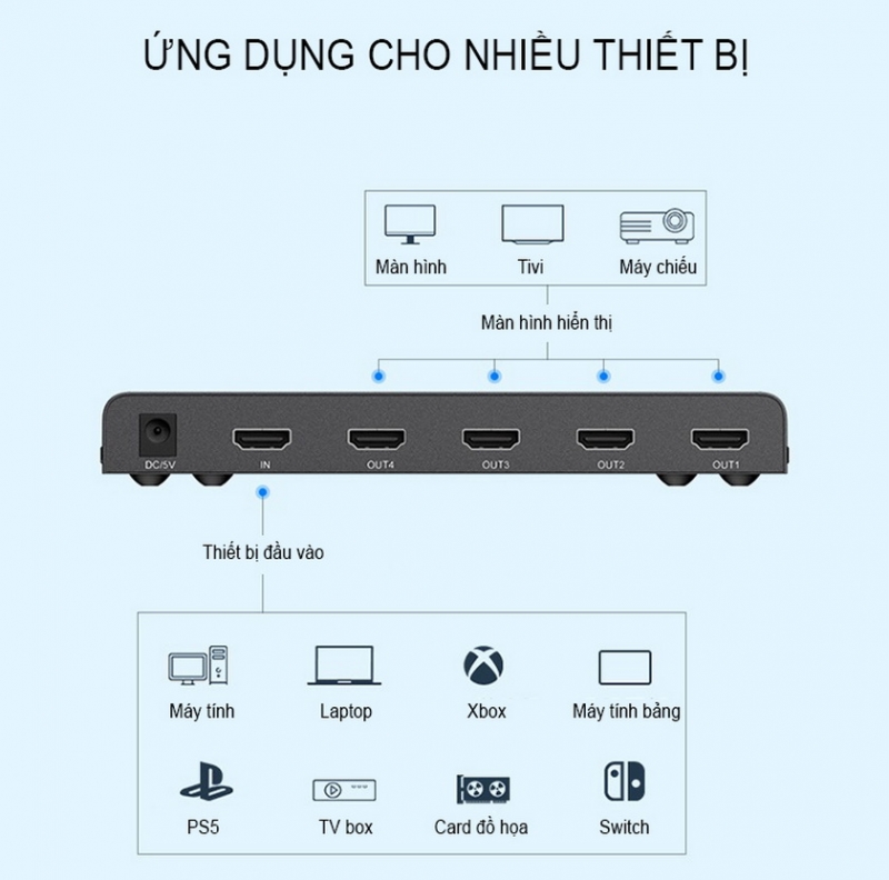 - Kết nối nguồn HDMI: Cắm cáp HDMI từ nguồn phát (như máy tính, đầu Blu-ray) vào cổng HDMI IN của bộ chia.
