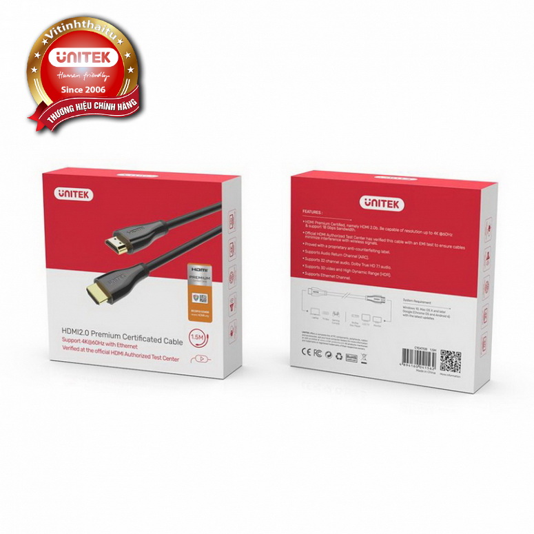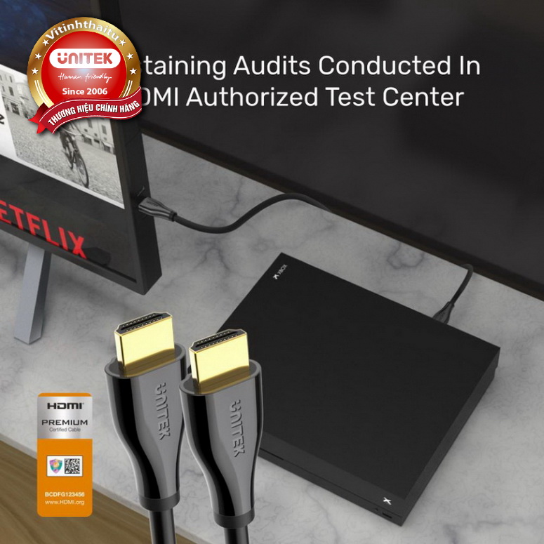 HDMI Premium Certified, chuẩn cáp HDMI 2.0b. Có khả năng phân giải lên đến 4K @ 60Hz và hỗ trợ băng thông 18 Gbps.