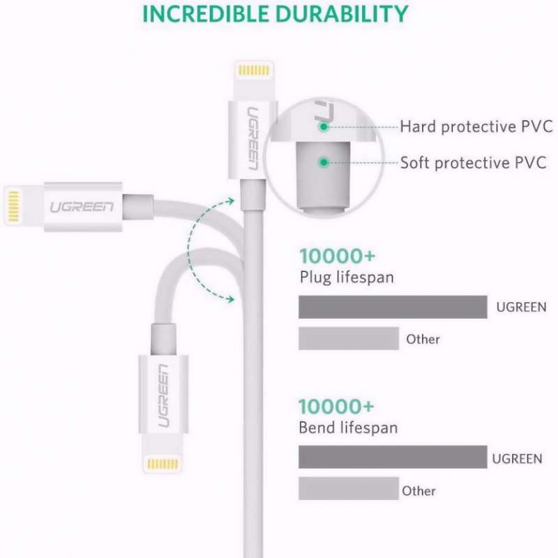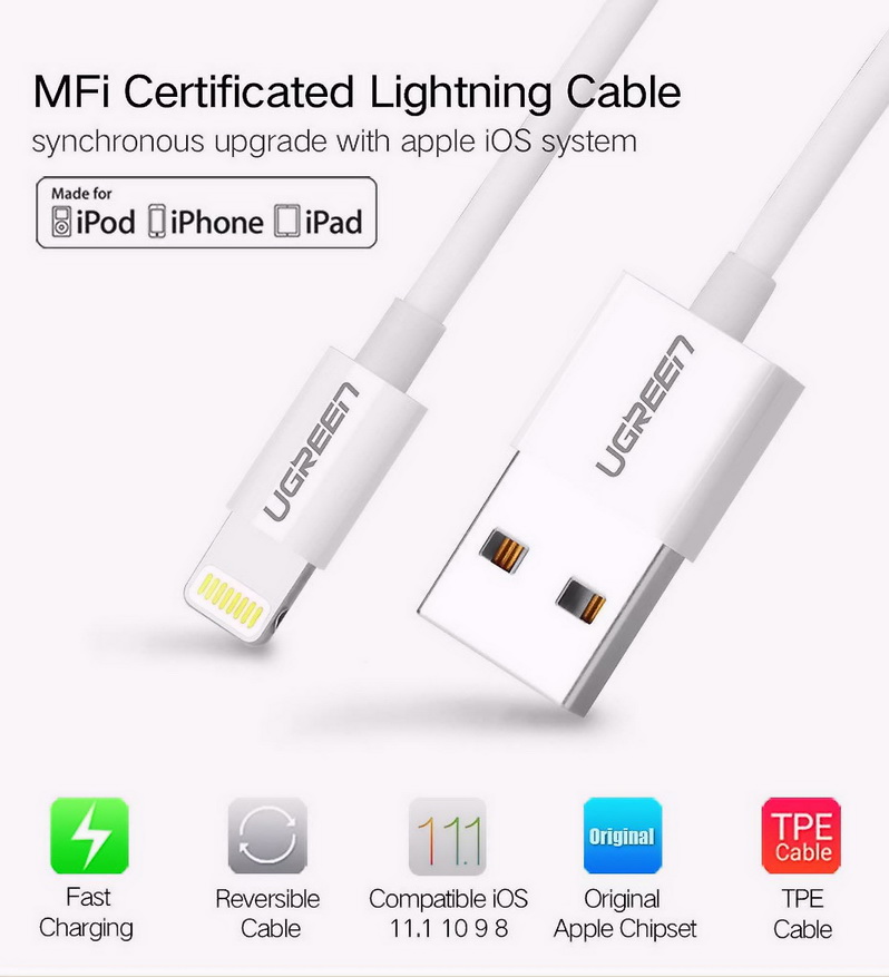 DÂY USB LIGHTING DÀI 1M CÓ CHIP MFI CAO CẤP CHÍNH HÃNG UGREEN 20728